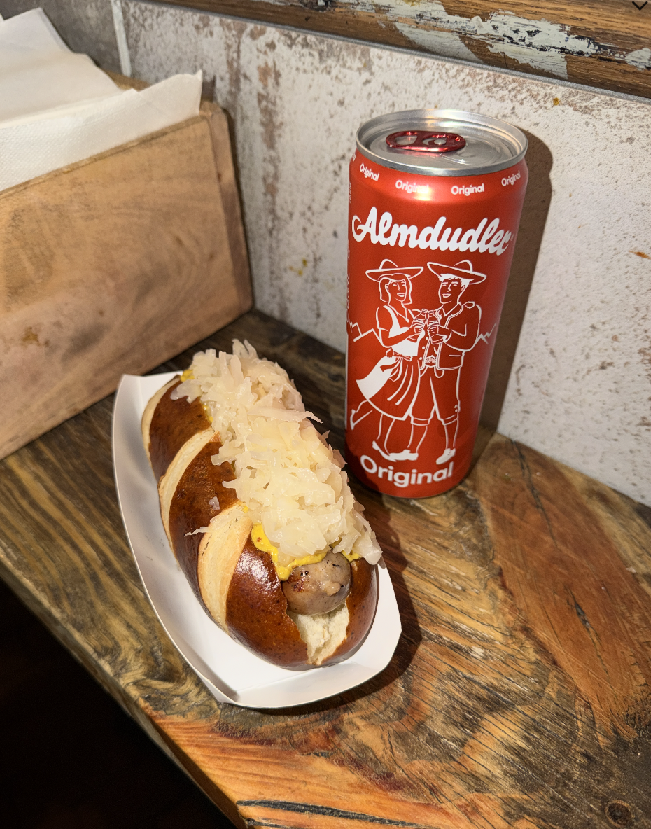 At Schaller’s Stube Sausage Bar, I ordered the bratwurst exactly as instructed: sauerkraut, mustard, pretzel bun. No edits. It delivered. Let’s talk about the pretzel bun. Sturdy. Chewy. Built for the job. It actually holds up against a juicy sausage without collapsing halfway through. Potato buns? Too soft. Structurally unserious. Pretzel bun supremacy—always.